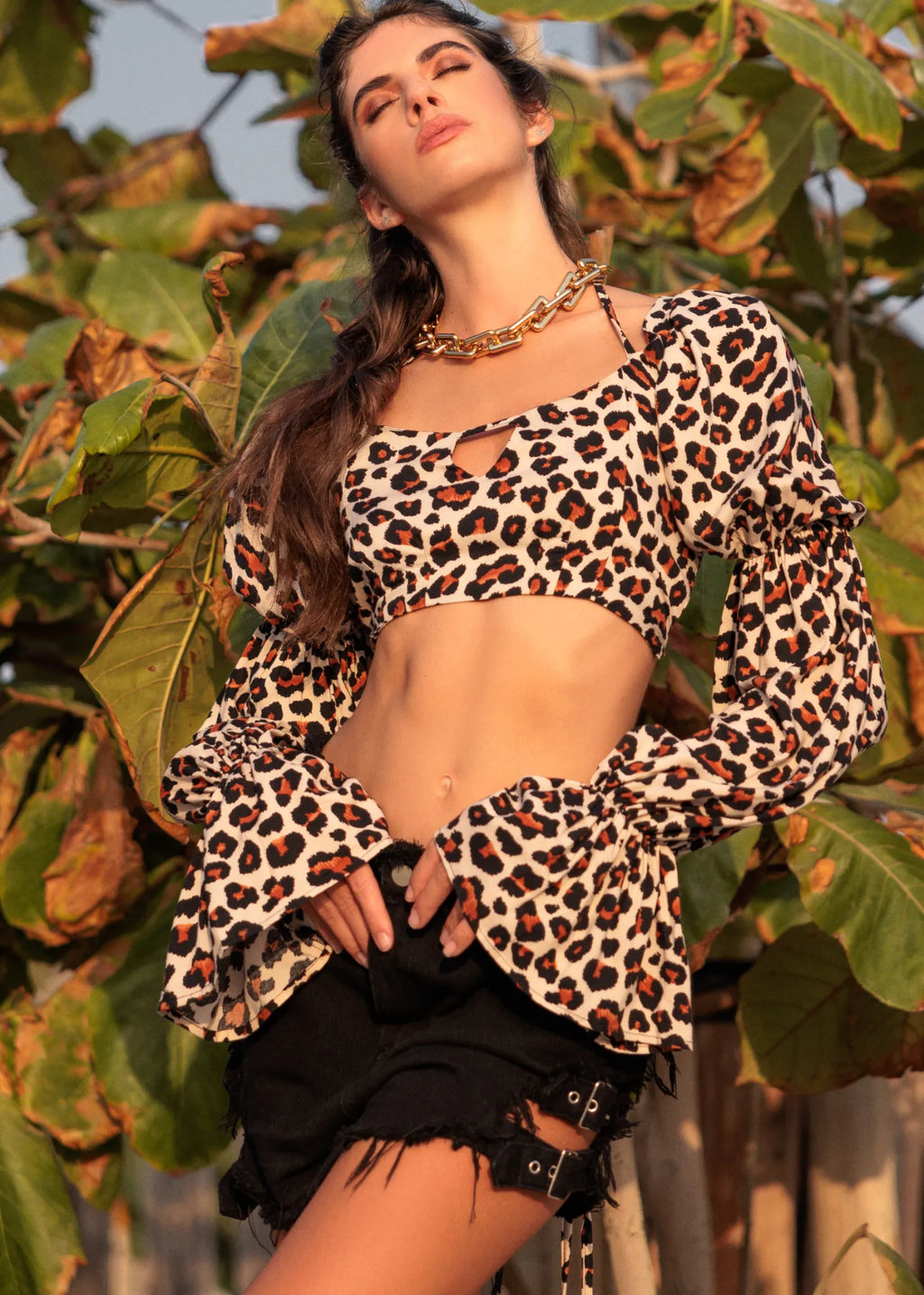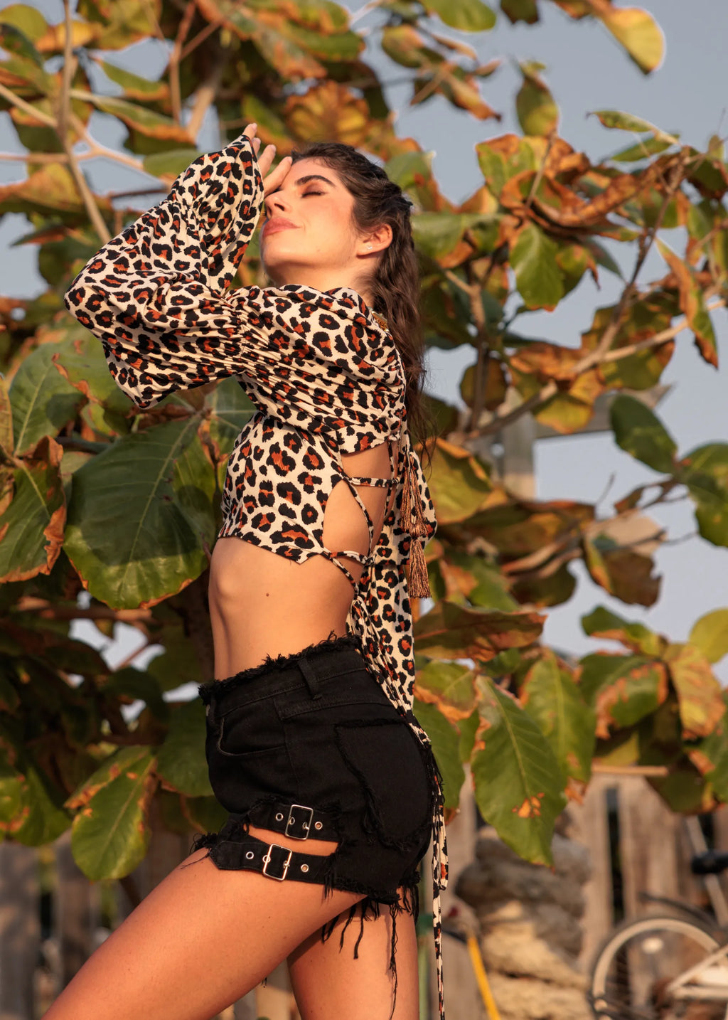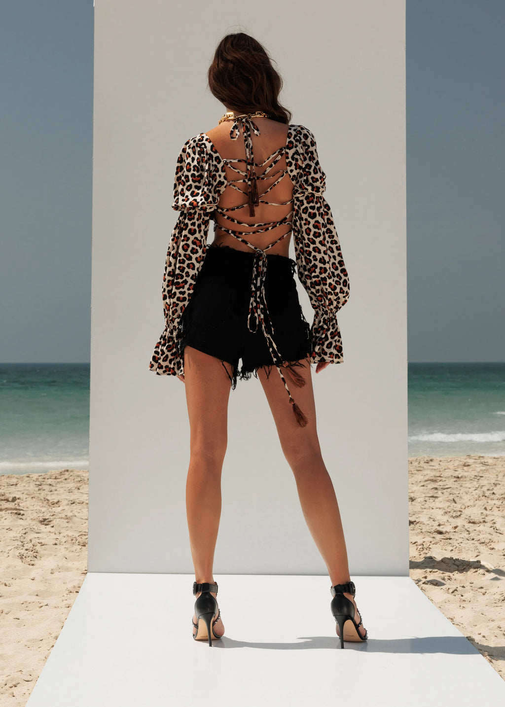 Back lace closure long sleeve animal print top