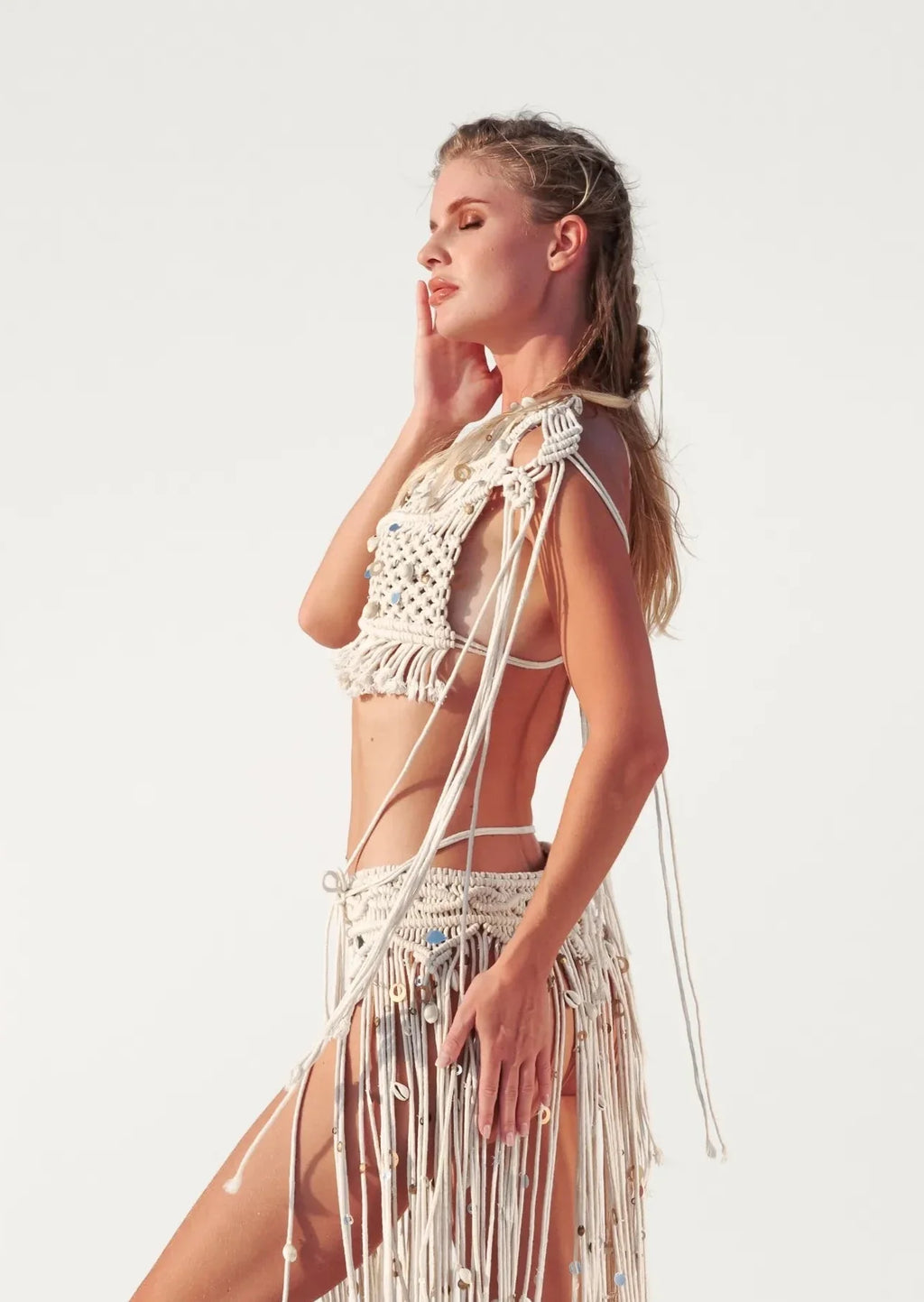 Introducing the stunning River Macrame Top in a timeless bone hue. Crafted from breathable cotton, this elegant crop top showcases intricate macrame detailing, exuding bohemian charm. With its versatile and neutral color, the River Macrame Top is a perfect addition to your wardrobe for effortlessly stylish and breezy summer looks.