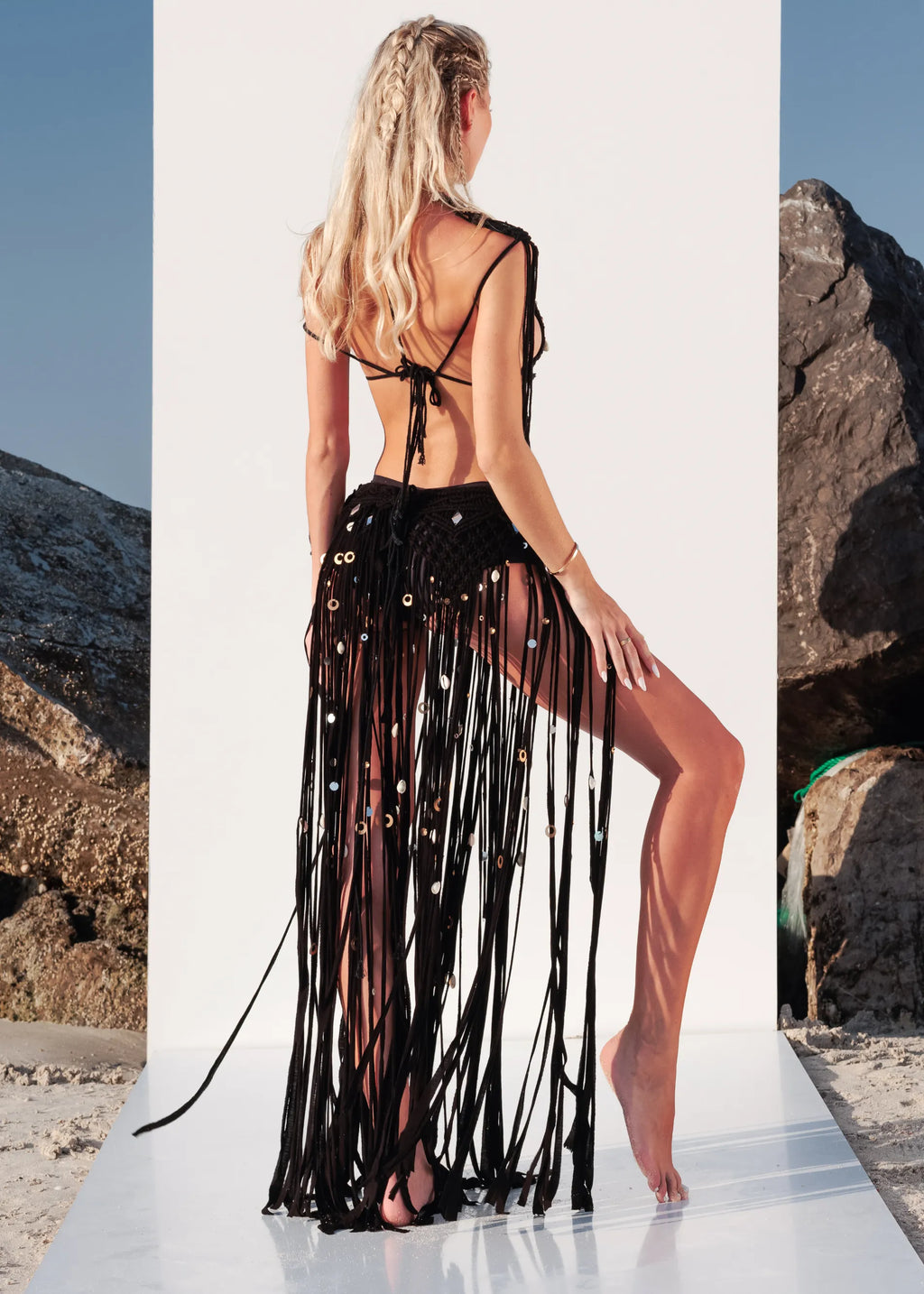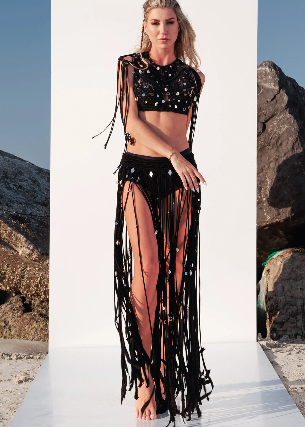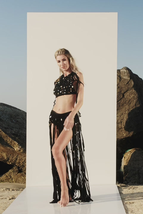 Introducing the captivating River Macrame Top in chic black. This stylish crop top, crafted from breathable cotton, features intricate macrame detailing adorned with shells and mirrors. With its unique shoulder coverage, the River Macrame Top offers a perfect blend of bohemian flair and contemporary style for any occasion.